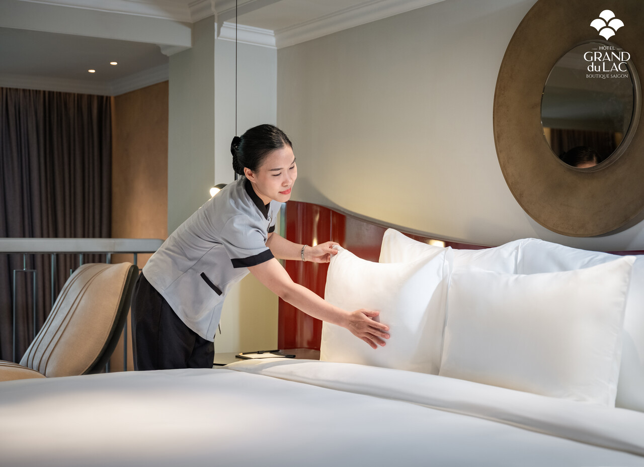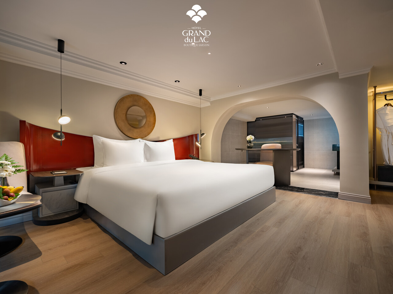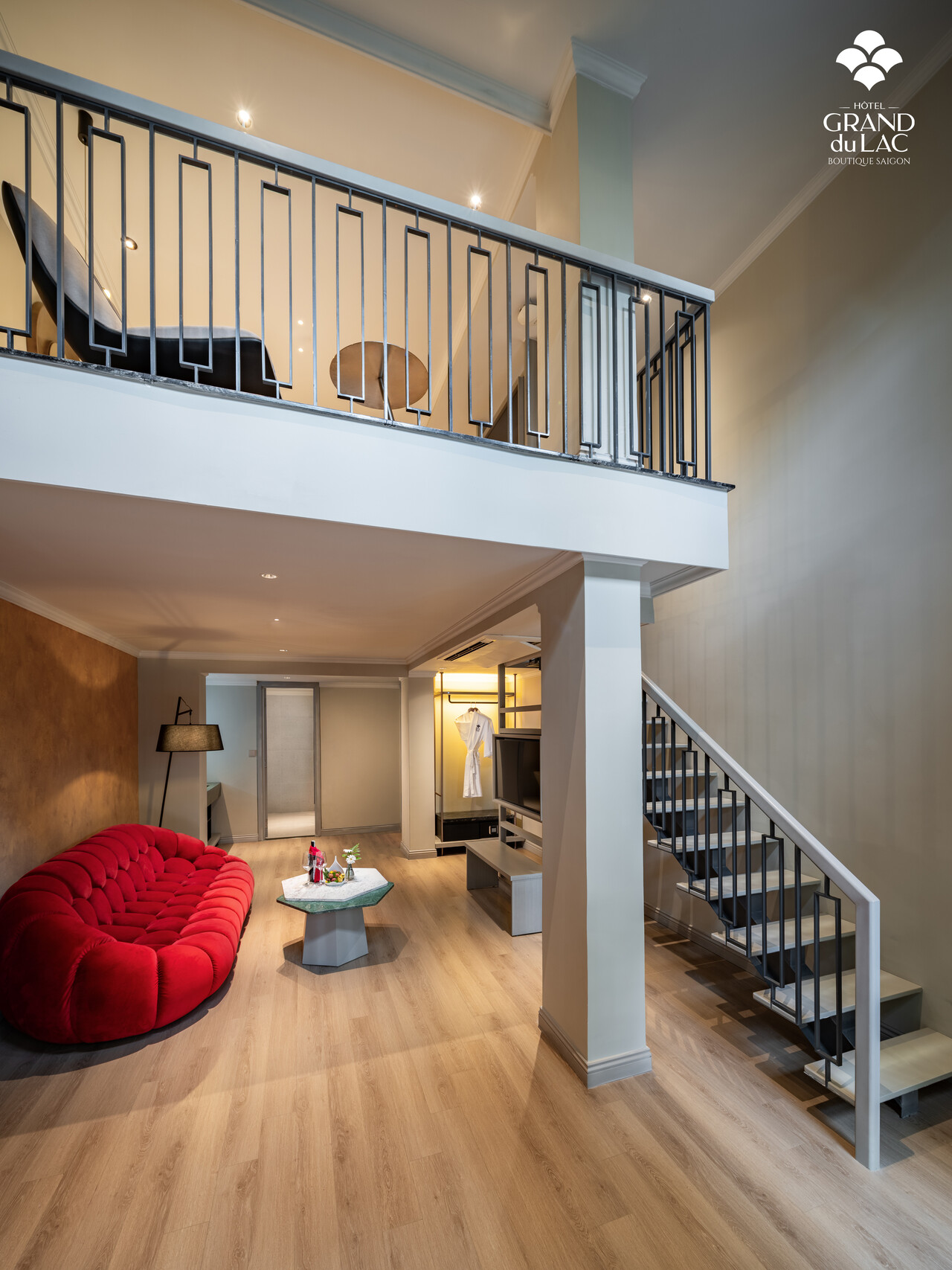 This luxurious two-story suite, designed in elegant Italian style, offers a prime frontage location with distinct living spaces. The first floor features a spacious living area and bathroom, while the second floor houses a serene bedroom. The modern bathroom, equipped with a bathtub and walk-in shower, ensures ultimate relaxation after a day of exploring the city.