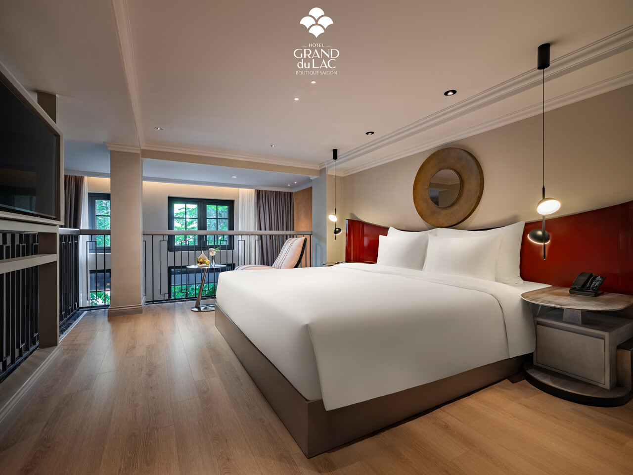 The spacious room is designed in a modern Italian style, offering an elegant ambiance filled with natural light from large windows and an airy balcony.