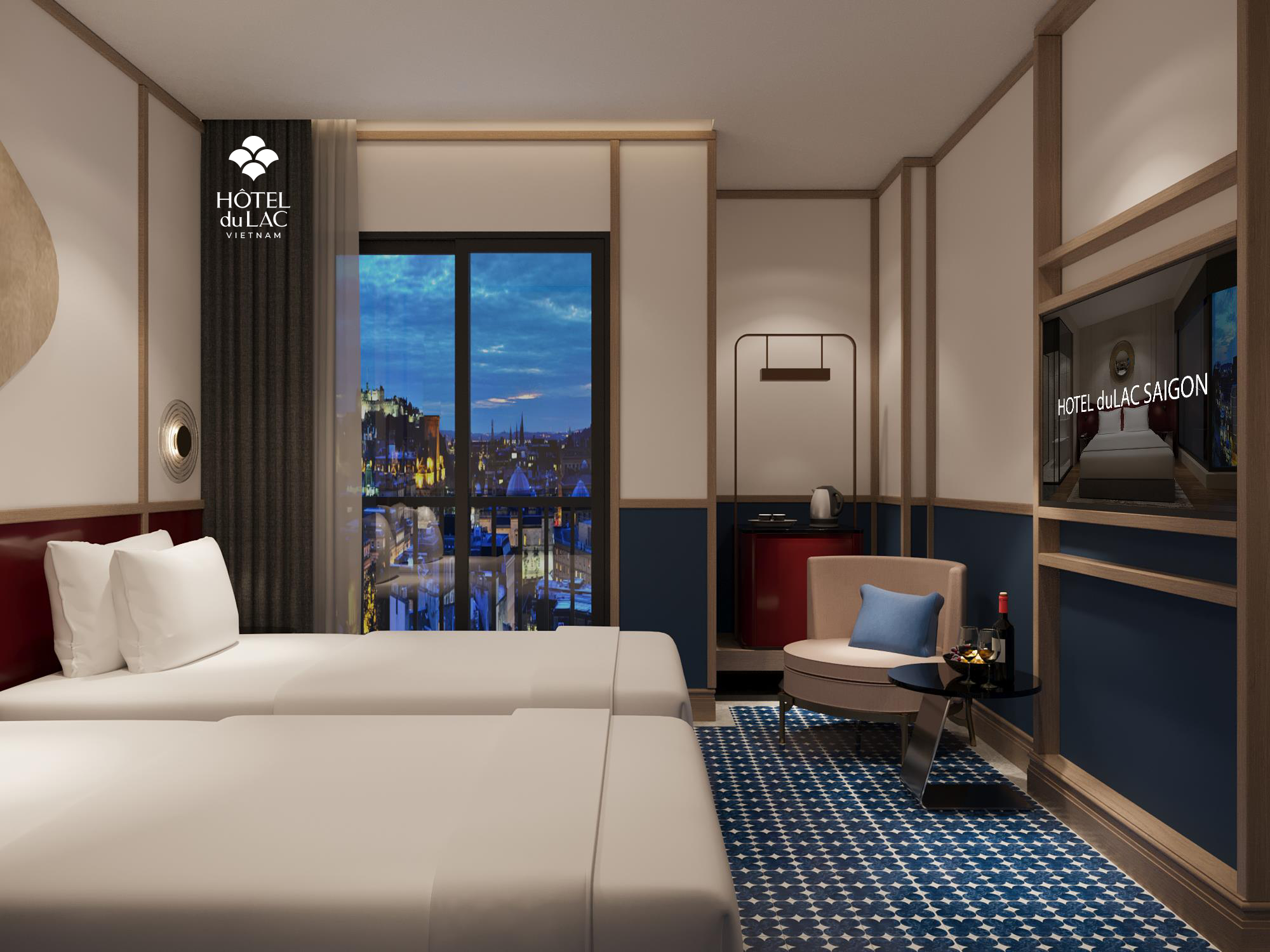 Designed in a modern Italian style, the room exudes elegance and sophistication with premium furnishings, warm deep brown tones, and refined golden accents. A spacious private balcony overlooks the vibrant cityscape, where illuminated skyscrapers paint a dazzling panorama. This is the perfect retreat for travelers seeking ultimate comfort and luxury.
