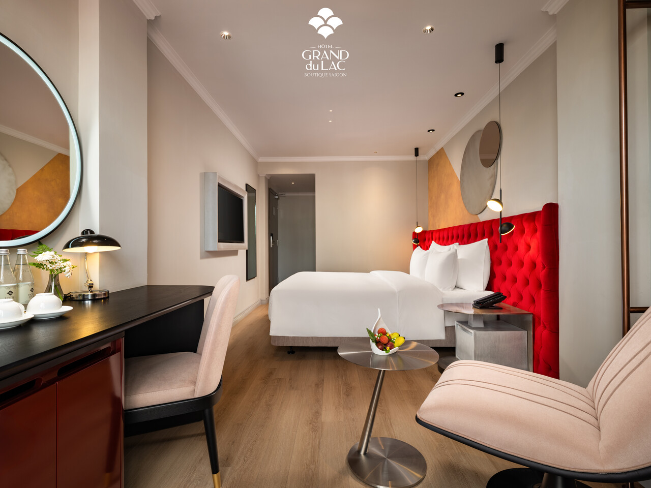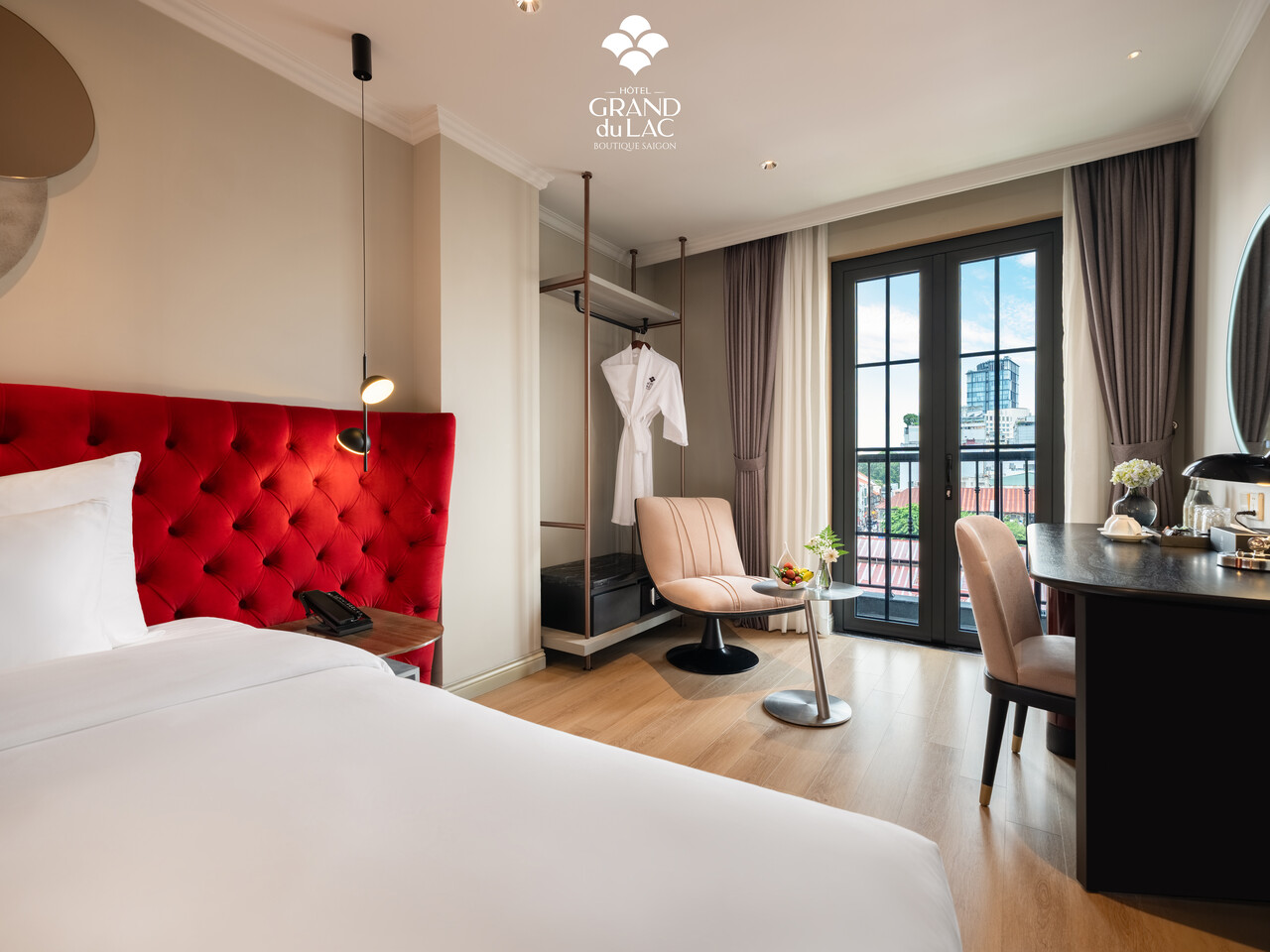 The room is elegantly designed with premium furnishings, featuring deep brown and golden tones that create a warm and sophisticated ambiance. The airy balcony opens up to the vibrant cityscape, offering a stunning view of the bustling streets and the lively atmosphere around Ben Thanh market. A perfect space to relax and fully immerse yourself in the city's dynamic energy.